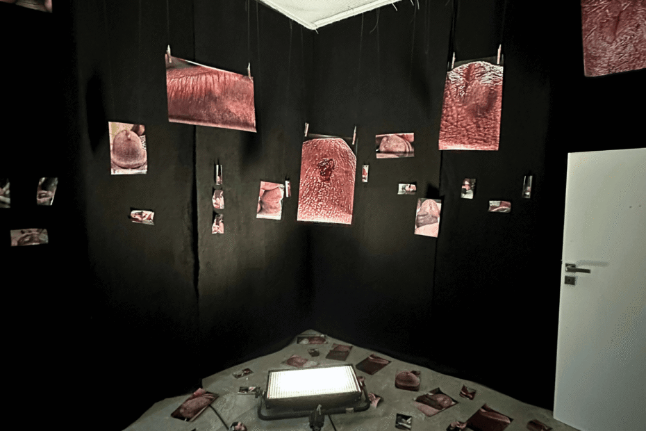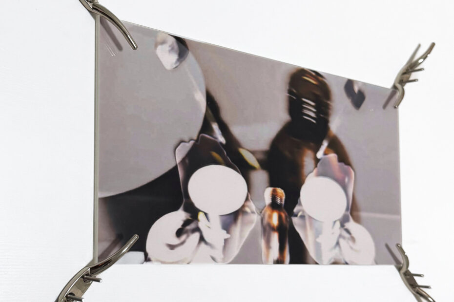 Paulina Aumayr Oil on canvas on a duvet and pillow turns a bed into a site of tension. Canine figures intertwine on the duvet, while the pillow bears human teeth, evoking power and control. Addressing… Der Geschmack von Metall