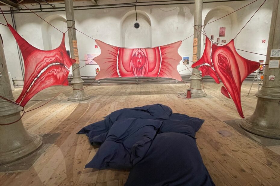 Tomschi and Barbara Mendez-Mendez Der 5×3 m lange Vorhang bildet zwei abstrahierte weibliche Körper ab. Lange schwarze Haare ziehen die Konturen nach und heben die Subjekte hervor. Körperbehaarung, kann vor allem bei Weiblich Sozialisierten Personen,… busen hüpfen, tanzen weich / Ein Körpervorhang