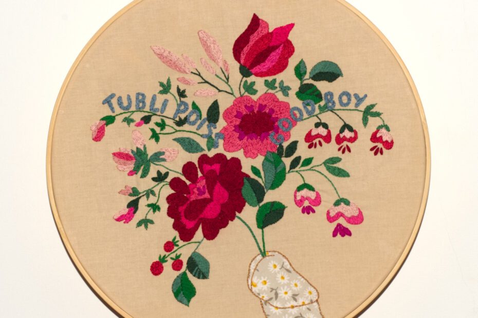by Tiina Sööt This work engages with the visual language of traditional floral embroidery and folk textiles. The words “good boy” (written in English and in Estonian) can be read as affectionate praise, as ironic…
