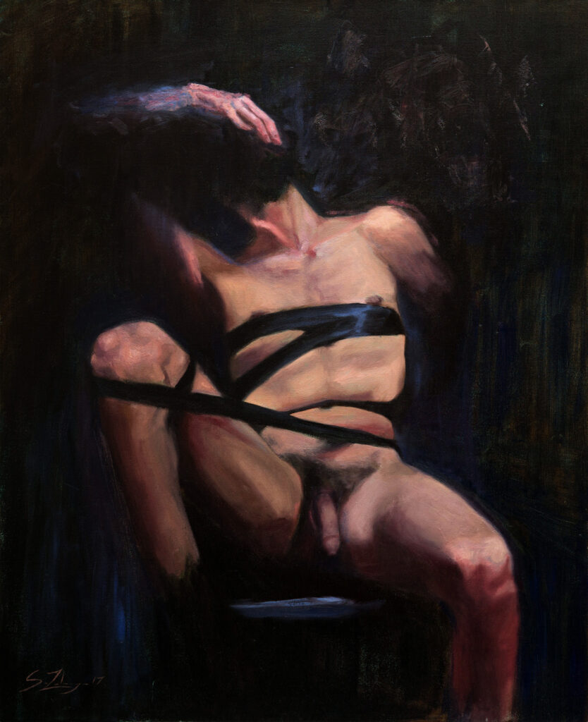 Folie: Hysteria and Folie: Delirium are oil paintings of nude bound bodies meant to be experienced as a dyptich. The works examine conditioning, control, and the struggle to break free. The tape functions both as containment and as a graphic element that traces patterns of constraint across the body. The overall effect is simultaneously confrontational and vulnerable, inviting reflection on power, habit, and the will to undo what binds.