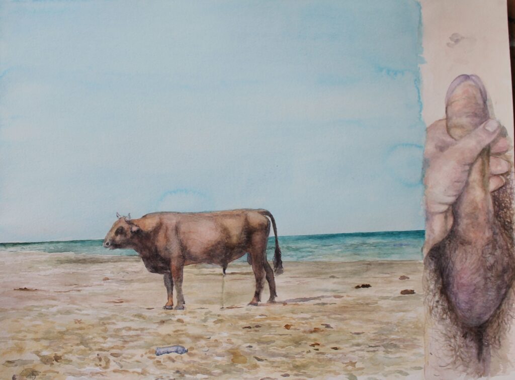 “Pissing Bull”, Watercolour on paper, framed 52×66 cm. 2015. Water painted with water, laying in the sun at the shore of the poor Black Sea near the Delta of the Danube. The sand, the sun, the sea, a nice touch. Not more, not less.