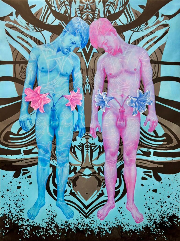 Sticky Dreams(2026 120x160cm) is based on a real dream of a classmate from my teenage years at art school. This dream, rather this concept, haunted and inspired my creativity profoundly and for a long time. I’ve slightly modified the recently created work. I painted two figures facing each other to emphasize the feeling of narcissism or homosexuality. Bodies becoming desire is not afraid of contradictions. The entire painting has a psychedelic and glamorous feel like looking into a kaleidoscope.