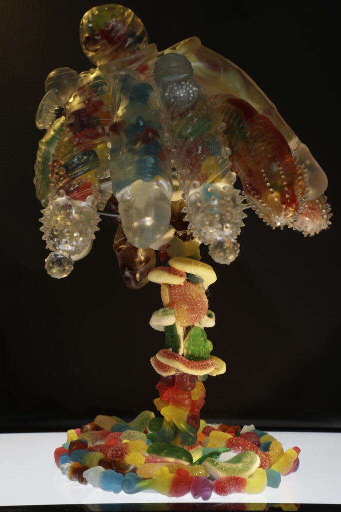A small sculpture made from sex toys, specifically penis extenders and candies.