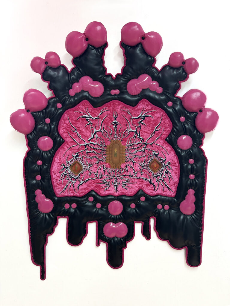 This wall-mounted retable stages conjurations rooted in mystic cybersigilism. At its core, a sigil—formed from a USB stick, a PrEP pill, and a Viagra encased in latex—emerges from a feline mouth, slick with oil.
